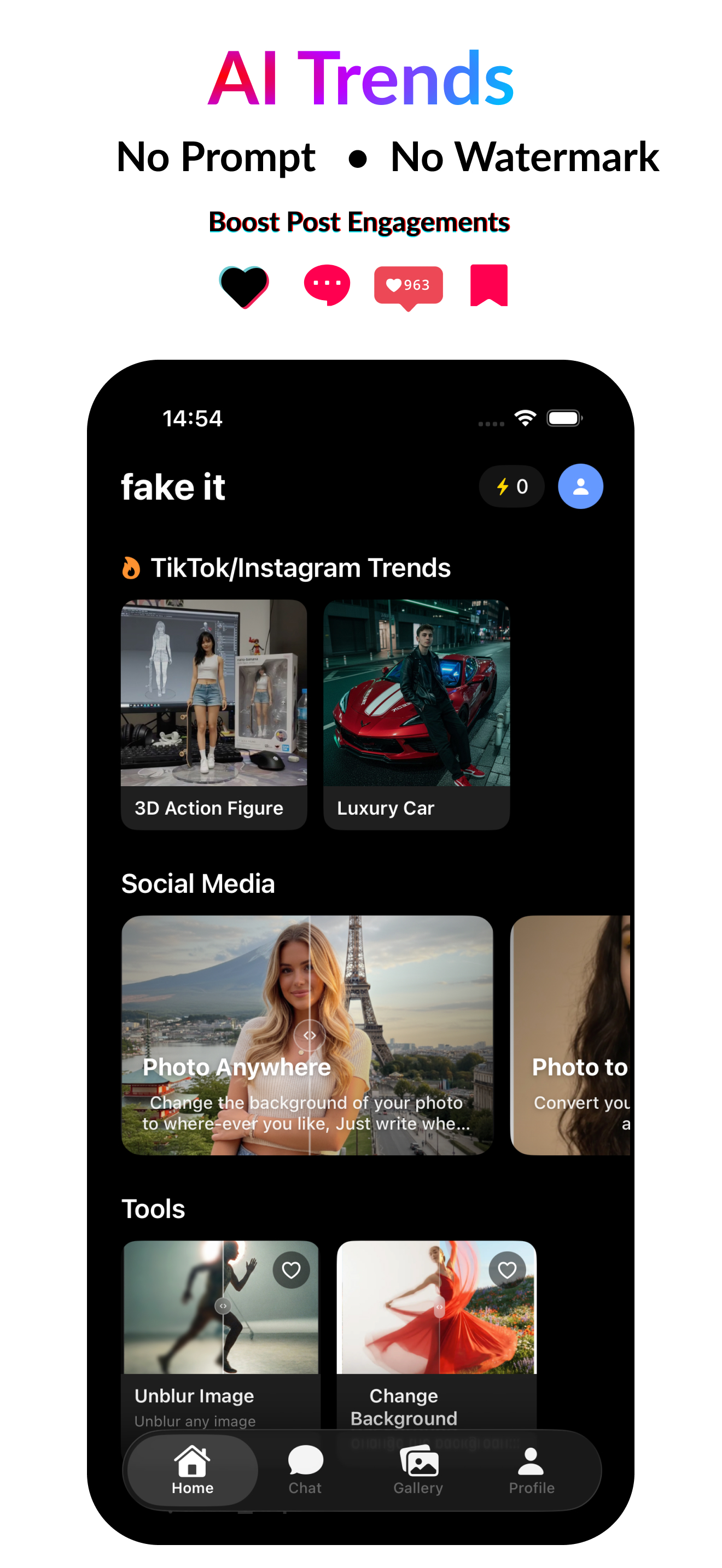 Fake It is the ultimate AI photo generator combining nano banana app features, Gemini photo trends, and AI art generator capabilities. Create content with our AI post maker, flyer maker, and ad maker. Use AI text to image and Gemini prompts for stunning results.
